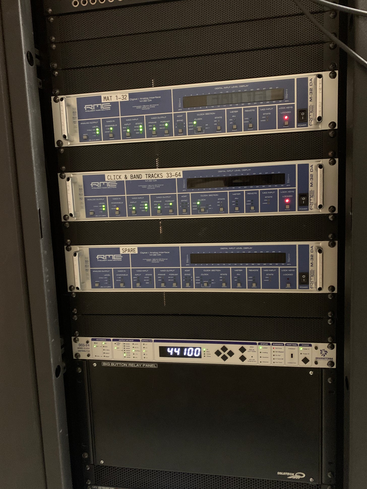 The system interfaces from the computer with RME Hammerfall HDSPe cards. Each computer has a card that is fed into a MADI bridge that allows for switching between computers. The switch is triggered by the conductor/band leader. It’s part of the legacy design using MIDI Solutions F8 and R8 contact closure and relay to MIDI boxes. It’s a two button switch box. The MIDI and sysex are programmed into an F8 which changes the MADI bridge (sysex) to the correct computer, changes the MIO XL MIDI patcher (MIDI) so the correct source MIDI is being used. The R8 is sending a tally light to the button in use for visual feedback. We also send MIDI to the guitar rig that controls his patches and FX, a couple of different switchers and volume changes. He spends most the show in the performance space so he’s not down at his rig in the studio two floors below stage level.